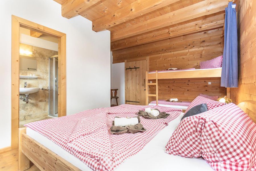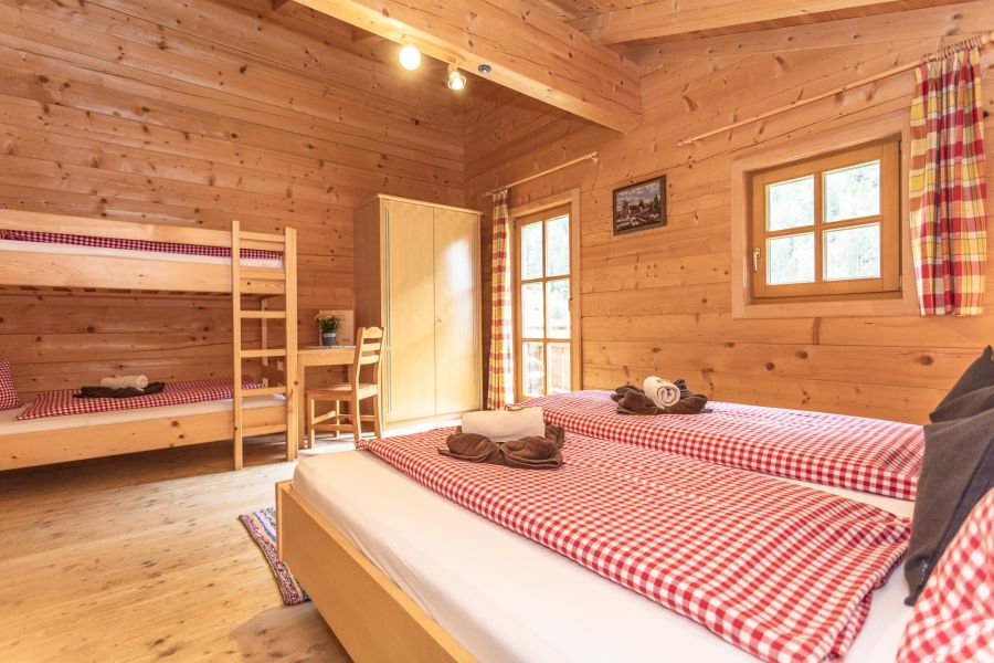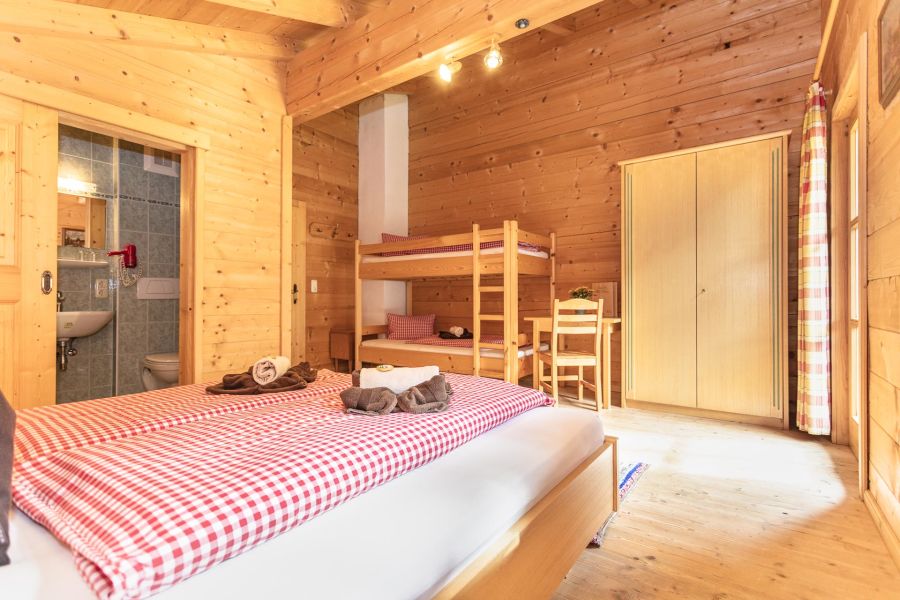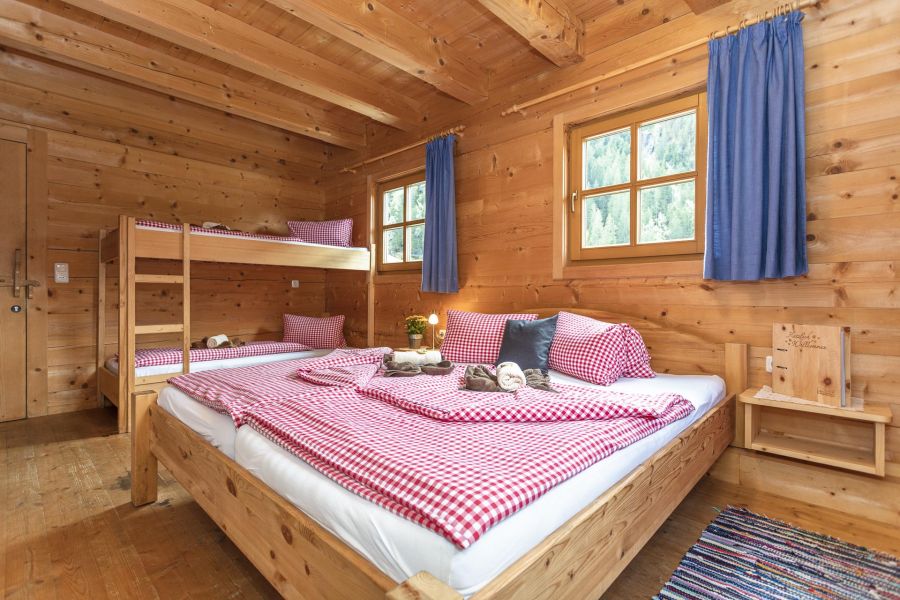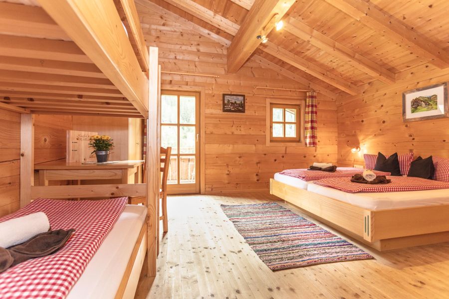 Unsere Familienzimmer in unserer Smaragdalm wurden ebenfalls komplett mit Holzelementen ausgestattet und versprühen so ein weiteres Almfeeling. Die Vierbettzimmer sind jeweils mit einem Doppelbett und Hochbett ausgestattet. Weiters besitzt jedes Zimmer ein eigenes Bad mit Dusche und WC. Jedes der Familienunterkünfte besitzt einen Balkon mit direktem Blick auf die Bergwelt des Habachtals.